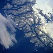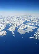 ![]() Cabo Farewell (en el centro) y la escarpada costa sur de la isla de Egger. La costa (oscura) está generalmente rodeada por un mar helado | ||