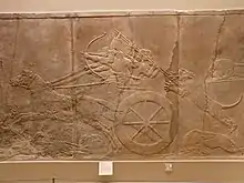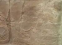 - Asurbanipal hiere a un león con la lanza desde su carro. - relieve conservado en el Museo de Pérgamo.
