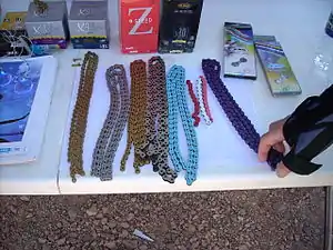 Para reducir su peso, las cadenas se fabrican con pasadores huecos y con piezas recortadas en los enlaces.[17] Las cadenas también se fabrican con acero inoxidable para resistir la corrosión y de titanio para reducir aún más su peso, pero son materiales generalmente caros.[18][19] Una tendencia reciente son las cadenas de varios colores, y al menos un fabricante ofrece un modelo de cadena específicamente para bicicletas eléctricas.[20]
