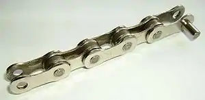 Una cadena de bicicleta es una parte del dispositivo mecánico utilizado en este tipo de vehículos para transmitir la potencia de tracción entre los pedales y la rueda trasera. Está compuesta de una serie de eslabones en forma de rodillos articulados, fabricados a medida del paso de las ruedas dentadas con las que engranan. La mayoría de cadenas de bicicleta están hechas de acero al carbono o aleado, aunque existen modelos niquelados que se fabrican para impedir su oxidación o sencillamente por motivos estéticos.
