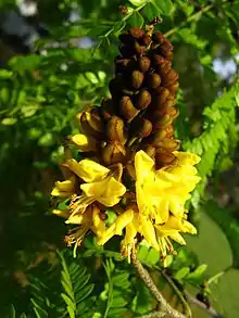 Tiene las hojas son bipinnadas con el eje central de 20-25 cm de largo, con 8-9 pares de pinnas, cada una con alrededor de 11 a 13 pares de foliolos de 10-12 mm. La floración ocurre entre de agosto y se extiende hasta el final del verano, produciendo inflorescencias cónicas en racimos erectos de flores amarillas. Las vainas de las frutas da lugar a dos válvas compuestas leñosa seca larga y correosa, con 7,6 a 12,0 cm de largo por 2.7 a 3.1 cm de ancho. Cuando están maduras, las vainas se abren girando en una explosiva dehiscencia expulsando 1-5 semillas. Estas son comprimidas, irregularmente circulares, transversales, ovato-obovadas o orbiculares a subglobosas con un frente muy duro y rígido, claro, espesa o sin albúmina, provisto de una boquilla en el hilio y con margen. Pueden vivir más de cien años.