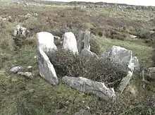 - Esta obra contiene una traducción total derivada de «Court cairn» de Wikipedia en inglés, concretamente de esta versión, publicada por sus editores bajo la Licencia de documentación libre de GNU y la Licencia Creative Commons Atribución-CompartirIgual 3.0 Unported.