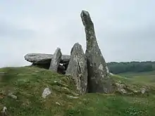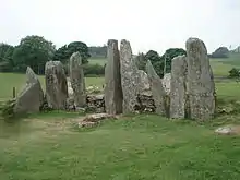La tumba en sí tiene dos cámaras. La cámara exterior, a la que se entraba por la fachada, contenía un fragmento de un hacha ceremonial de jadeíta, junto con fragmentos de cerámica neolítica y una punta de flecha en forma de hoja. El ajuar funerario tardío comprendía vasos de cerámica de Peterborough y del vaso campaniforme y un cuchillo de pedernal. La cámara interior estaba construida como una caja cerrada y era inaccesible desde la exterior. [3] Probablemente originalmente estaba techado por una gran losa de piedra que descansaba sobre las dos losas del extremo más altas. La cámara interior contenía una cista secundaria, con vasos de alimentos y una piedra tallada en forma de copa y anillo.