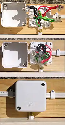 Caja de junción montada en superficie interna en Australia- mostrando las etapas de cableado.