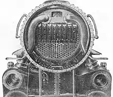 Las locomotoras equipadas con un sobrecalentador generalmente tienen situado su cabezal en la caja de humos. El vapor entra al cabezal como vapor "húmedo" (saturado) y luego pasa a través de un elemento sobrecalentador, una tubería que pasa dos veces a través de un tubo de humo ampliado en la caldera.[1] El vapor entra en una cámara separada en el cabezal, esta vez como vapor sobrecalentado o seco. La ventaja del sobrecalentamiento es que el vapor tiene mayores propiedades expansivas al entrar en los cilindros, por lo que se puede obtener más potencia con una menor cantidad de agua y combustible.