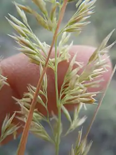 Es una planta perenne que crece de un solo tronco, sin formar un penacho o grupo herbáceo. Crece hasta los 60 centímetros de altura. Cuenta con una red de finos rizomas y raíces que la sujetan el suelo, formando césped. Las raíces se han observado que penetran más de un metro de profundidad en el suelo. Las hojas, laminadas rígidas se encuentran principalmente alrededor de la base del tallo y alcanzan hasta 15 centímetros de largo por unos pocos milímetros de ancho. La inflorescencia es una panícula estrecha de hasta 10 centímetros de largo. La espiguilla contiene una flor.[1] La planta se reproduce vegetativamente por brotes de su rizoma y sexualmente por sus semillas dispersadas por el viento.