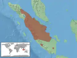 Es endémica de Sumatra y algunos islotes adyacentes en el estrecho de Malaca.