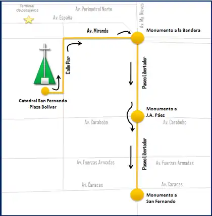 - Partiendo de la Santa Iglesia Catedral, en la Plaza Bolívar, bordeando la catedral hasta la calle de atrás, y de ahí con rumbo norte por dos cuadras hasta la Av. Miranda.