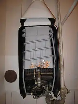 Consiste en un serpentín por donde circula el agua, que rodea primero una campana de sección rectangular y en la parte superior de la campana toma la forma de un intercambiador de calor de tubos con aletas. El combustible (como se ha dicho, normalmente gas) se quema en una serie de candelas situadas en la parte inferior de la campana; la llama precalienta el agua del serpentín que rodea la campana y termina de hacerlo en el intercambiador de la parte superior. Evacua los gases de la combustión una vez pasado el intercambiador y debe de hacerse, por medio de un conducto apropiado, hasta el exterior.