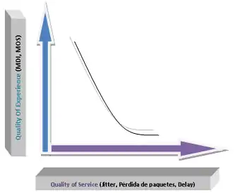 La imagen a la derecha permite observar una relación no lineal que se presenta entre un factor subjetivo de métrica para QoE en este caso MOS, y los factores objetivos del rendimiento de la red como pérdida de paquetes, disponibilidad, retraso, etc.