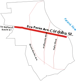 Al atravesar el Bv. Avellaneda su nombre cambia por el de Av. Eva Perón.