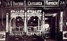 Actualmente acoge una farmacia, con una colección de botes y objetos de laboratorio. Sus cristaleras están grabadas con motivos florales modernistas.