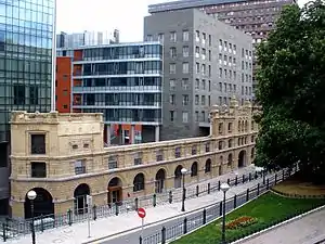 ![]() Calle Uribitarte, con la fachada del antiguo Depósito Franco en el primer plano, el edificio Albia al fondo y el complejo arquitectónico de Isozaki Atea, visto desde su lado posterior. | ||