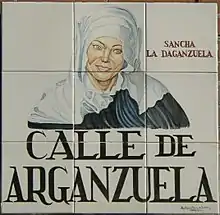 La leyenda popular que remonta el origen de esta calle al reinado de Isabel la Católica, relata la historia de la familia de un alfarero venido del pueblo de Daganzo que, viudo y con varios hijos, se instaló en una alquería de las inmediaciones.[nota 2][3] Tenía el alfarero una hija, "Sanchica" (diminutivo de Sancha), la menor de los hermanos, que a pesar de ser pequeña y enfermiza, subía a diario las cantarillas del cercano río Manzanares necesarias para el trabajo del alfar y la subsistencia familiar. Y ocurrió que pasó por allí la reina, sedienta para mayor fantasía. Le pide agua y Sanchica se la ofrece en su mejor cantarilla: Una lágrima en el rostro de la niña despierta la piedad y curiosidad de la reina. Tras la conversación, ordena a un hombre de su séquito que llene tres veces el cántaro y riegue el perímetro de una pieza de tierra que regala como dote real a la muchacha. El lugar empieza así a llamarse "de la Daganzuela" (la ‹chicuela› de Daganzo), que más tarde se transformará en "la Arganzuela".[4][5] La "sanchica" alfarera acabó, como suele ocurrir en casi todas estas piadosas leyendas, en la Venerable Orden Tercera de San Francisco (de ahí que el ceramista Ruiz de Luna la pintase con toca blanca y saya oscura en la placa del callejero de Madrid).