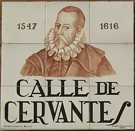Como otros muchos escritores, poetas y autores de comedias, Miguel de Cervantes Saavedra fue habitual vecino del barrio que por tal circunstancia se conocería siglos después como barrio de la musas. Ha quedado noticia de que habitó en él varias viviendas, primero en el número 16 de la calle de las Huertas; paso luego a la Plazuela de Matute (detrás del colegio del Loreto), y de esta al número 8 de la calle del León, casi sobre la plazuela del Mentidero. No se sabe si huyendo de los caseros, acabó sus días en otra casilla de la misma calle del León, que sus biógrafos la sitúan en el número 20 antiguo de la manzana 228, esquina a la calle de Francos, que a causa de su estado ruinoso fue demolida en 1833.[4] Cuenta Pedro de Répide que el cronista Mesonero Romanos dedicó uno de «sus más bellos artículos» a la profunda decepción que le produjo la demolición del edificio,[nota 1] y que cuando el rey se mostró dispuesto a comprar el solar para edificar en él «algún establecimiento literario» —según se lee en la real orden citada por Mesonero—, el propietario de la finca, Luis Franco, no lo consintió (o no le convino lo ofrecido por la casa real). Ya una vez construida una nueva vivienda en el solar, el 13 de junio de 1834 se colocó sobre la fachada del nuevo edificio levantado por el casero rebelde, ahora con entrada por la calle de Francos, un busto en relieve y una inscripción en memoria del ilustre «manco de Lepanto», costeada por el comisario general de Cruzada, Manuel Fernández Varela. Poco después el corregidor viudo de Pontejos cambió el nombre de la calle, que pasó a llamarse calle de Cervantes.[5]