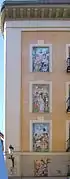 - Precisamente y como homenaje a Galdós y su obra, Mingote representa en el balcón inferior izquierdo su caricaturesca versión del novelista y cronista de España y los protagonistas de Fortunata y Jacinta: Don Benito, Fortunata, Jacinta y infame Juanito Santa Cruz. Falsos e inmortales, entre la placa de azulejos del callejero angituo de Madrid y el cartel ‘Asegurada de incendios’, con el sutil detalle de un “canario” y un jaula imaginarios, colgados en la reja de un inexistente balcón.