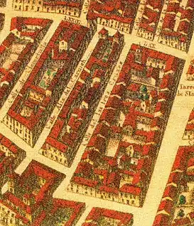 ![]() Calle de las Tres Cruces en el plano de Teixeira, 1656. | ||