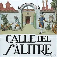 Mediado el siglo xvii, aunque no urbanizada en su totalidad, la calle que descendía desde la de Santa Isabel al postigo de Valencia,[lower-alpha 1] aparece rotulada como calle de San Bernardo en el plano de Texeira de 1656;[3] si bien en el plano de Espinosa de 1769 está rotulada sin embargo como calle de San Bernabé.[4][5] Fue conocida popularmente sin embargo como “calle del Salitre”, denominación que el consistorio municipal madrileño hizo oficial el 11 de enero de 1835.[2][lower-alpha 2] Aún hubo un periodo, ya en el siglo xx en que cambió su nombre por el de calle de Baltasar Bachero,[lower-alpha 3] nombre que mantuvo entre 1929 y 1967, año en que recuperó el de calle del Salitre.[6][2][7]