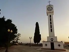 En el centro de la plaza se alza una torre-reloj de factura reciente.[1] Se trata de una torre prismática de ladrillo enlucido, de dos cuerpos; el segundo es un cubo con una base mayor que la del prisma que lo sustenta y alberga un reloj de cuatro esferas.[5] Está rematada por un tejadillo a cuatro aguas,[5] coronado por un crucifijo de forja.