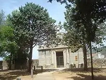 La portada de ingreso al recinto tiene un vano adintelado enmarcado por pilastras, y por encima del entablamento, una placa con la cruz y el año de construcción coronada con un frontón circular.
