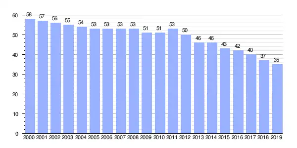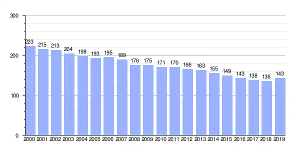 Gráfica de evolución demográfica de Calvos de Socamino (parroquia) entre 2000 y 2019 |