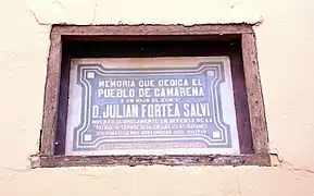 - Paisaje urbano de Camarena de la Sierra (Teruel), con detalle de lápida en memoria de D. Julián Fortea Salvi, Gobernador Civil-Militar de Filipinas, fallecido en las islas Batanes en 1898 (2017).