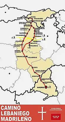 Este camino se basa en la antigua calzada de Toledo a Liébana, el Camino Lebaniego Madrileño, aprovecha la calazada romana desde Madrid por Segovia en este caso la Vía XXIV, por el actual Camino de Santiago de Madrid hasta Villalón de Campos y desde aquí sigue por Villada y Saldaña a enlazar con el Camino Lebaniego Castellano en Cervera de Pisuerga, otra variante enlaza en Medina de Rioseco por el canal de Castilla con el Camino Lebaniego Castellano.