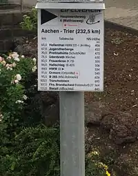 Su punto de inicio es el Jugendherberge (albergue juvenil) en Aquisgrán y su final la abadía de San Matías en la citada Tréveris.[35] Tanto la longitud del itinerario como la división en etapas varían levemente según la fuente que se consulte. Eifelverein indica en su página web una longitud de 243 km divididos en 12 etapas,[35] aunque su cartel final situado en la abadía de San Matías señala 228 km y carteles intermedios (como el de la imagen) indican 232,5 km. La plataforma en internet «Outdooractive» calcula 234,7 km hasta el puente Kaiser-Wilhem que, sumados a los 4 km dentro de la ciudad necesarios para llegar a la abadía, dan un total de 239 km; en cuanto a etapas, lo divide en 10.[39] Por otra parte, Willi Schwoll, autor de una de las pocas guías publicadas, utiliza las distancias de «Outdooractive» y divide la ruta en 11 etapas.[40]