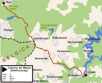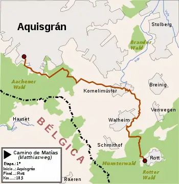 - «1. Etappe: Aachen - Rott, Königsberger Straße (18,7 km)». Hauptwanderwege. Matthiasweg (6) (en alemán). Eifelverein e.V. Archivado desde el original el 8 de abril de 2016. Consultado el 4 de octubre de 2016.