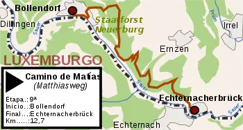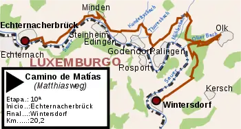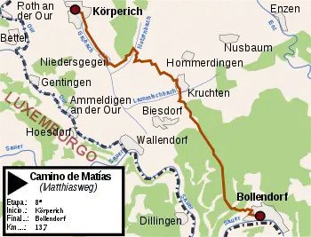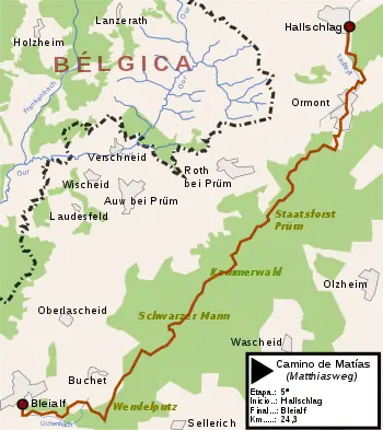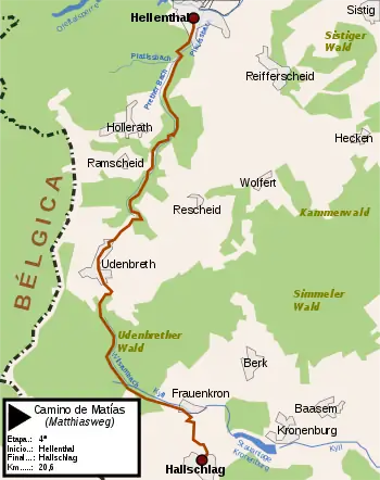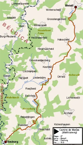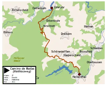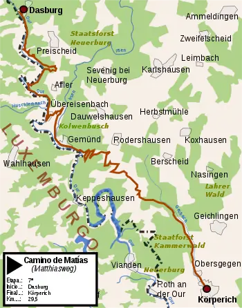 El “camino de Matías” —o Matthiasweg en idioma alemán— es la ruta de senderismo más occidental de las que Eifelverein tiene trazadas en dirección norte-sur.[35] Dichas rutas norte-sur están numeradas de la n.º 1 a la n.º 6 correspondiendo el n.º 1 a la más oriental y el n.º 6 (el camino de Matías) a la más occidental.[36]