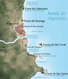 La guarnición española de Algeciras proveyó a los franceses de catorce cañoneros, así como de posiciones defensivas en los fuertes de Santiago —cinco cañones—, Isla Verde —siete cañones—, San García y las torres de la Vila Vieja y del Almirante. Durante la batalla, las baterías y los fuertes resultaron gravemente dañados, mientras que cinco de los cañoneros fueron destruidos y once hombres fallecieron. El número de heridos no consta en ningún informe. | ||||||||