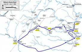 Casi al mismo tiempo Grant organizó la incursión de Wilson-Kautz, una operación de caballería en el centro sur de Virginia, que se libró entre el 22 de junio y el 1 de julio de 1864. Estaba también dirigida contra los ferrocarriles confederados de Petersburg. La redada fue conducida por la caballería de la Unión bajo la dirección de los generales de brigada James H. Wilson y August Kautz, a quienes se les ordenó cortar los ferrocarriles de Weldon, de Southside y de Richmond & Danville. Si bien el ataque tuvo el efecto previsto de causar considerables daños a las comunicaciones ferroviarias de la Confederación durante varias semanas, la fuerza de ataque perdió toda su artillería, muchos caballos y casi un cuarto de la fuerza original. Aun así, en opinión de Grant, el daño al enemigo fue mayor que las pérdidas sufridas en el empeño.[12]