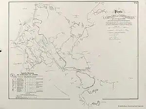 ![]() El mapa abarca toda La cordillera de los Altos, mazico montañoso entre los departamentos de Cordillera, Central y Paraguarí de la República del Paraguay, formando parte de la gran Meseta Brasileña. Se extiende desde el río Paraguay hasta las Serranías de Ybycuí. Entre sus estrivaciones y desfiladeros tuvieron lugar los enfrentamientos bélicos del mes de agosto de 1869 durante la Guerra del Paraguay. | ||||