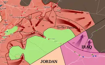 La Campaña del Desierto Sirio (mayo-julio de 2017) fue una operación militar del ejército sirio (SAA) que inicialmente comenzó a lo largo de la carretera de Damasco a la frontera con Irak contra las fuerzas rebeldes durante la Guerra Civil siria. Su primer objetivo era capturar tanto la carretera como el cruce fronterizo de al-Tanf, asegurando así el campo de Damasco de un posible ataque rebelde.[37][38] Más tarde, se abrieron muchos otros frentes como parte de la operación en todo el desierto, así como la operación "Grand Dawn" contra EIIL con el objetivo de reabrir la carretera Damasco-Palmira y prepararse para una ofensiva hacia Deir ez-Zor.[39][40]