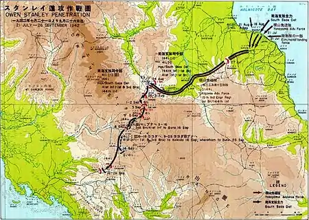 El coronel Yokoyama ordenó al coronel Tsukamoto tomar la pista de aterrizaje en Kokoda, y conducir una fuerza de reconocimiento a lo largo del camino de Kokoda. Al encontrar a las tropas australianas desplegadas cerca de Kokoda, Tsukamoto desplegó a su infantería e infantes de marina para un ataque, y rápidamente se movió al interior.[7]