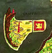 En 1507, el navegante Afonso de Albuquerque firmó un acuerdo con los soberanos de Ormuz para la construcción de una fortaleza en la isla. La obra fue posteriormente abandonada pero Portugal finalmente se estableció en Ormuz en 1515.[1] Así es como Piri Reis, el famoso almirante otomano que más de 25 años después tomó la iniciativa de desalojar a los portugueses, describe la posición de los portugueses en su portulano Libro de las Materias Marinas, en turco Kitab-ı Bahriye escrito en 1526 :