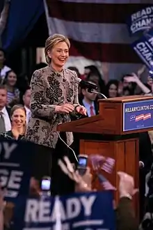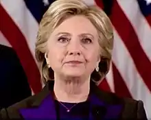 Clinton concedió la derrota en las elecciones presidenciales de 2016 ante el republicano Donald Trump el 9 de noviembre después de que los medios de comunicación declararan que Trump había superado el umbral de 270 votos del colegio electoral requerido para ganar las elecciones y poner fin a la campaña.[10] Si Clinton hubiera sido elegida, habría sido la primera mujer y la primera esposa de un presidente de los Estados Unidos (Bill Clinton) en ganar ella misma la presidencia. Bill Clinton también se habría convertido en el primer caballero de Estados Unidos.