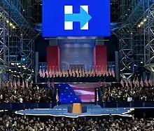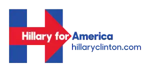 El logotipo de la campaña de Clinton se dio a conocer el 12 de abril de 2015, presentando una H azul con una flecha roja en el medio.[42]