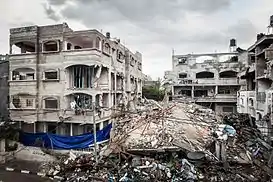 Durante el conflicto entre la Franja de Gaza e Israel de 2014, la artillería de Israel alcanzó una escuela de las Naciones Unidas (UNWRA) en el campamento de Jabalia, matando al menos 15 palestinos que se refugiaban allí.[25][26] Un portavoz de la ONU declaró: "Anoche fueron asesinados niños mientras dormían junto a sus padres en el suelo de un aula en un refugio de la ONU en Gaza. Los niños murieron mientras dormían; esto es una afrenta para todos nosotros, un motivo de vergüenza universal".[27] UNRWA aseguró que había comunicado hasta en 17 ocasiones a las autoridades israelíes tanto la ubicación de la escuela como el hecho de que en ella se alojaban miles de desplazados.[28] En un bombardeo distinto, un misil israelí destruyó la mezquita de Omar, con base del siglo VII y añadidos del XIV.[29]