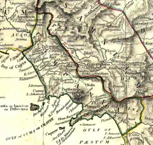 - Esta obra contiene una traducción derivada de «Campania antica» de Wikipedia en italiano, publicada por sus editores bajo la Licencia de documentación libre de GNU y la Licencia Creative Commons Atribución-CompartirIgual 3.0 Unported.
