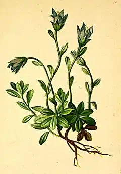 Es una planta perenne que alcanza un tamaño de 2-6 cm de altura, pubescente, la cepa en forma de roseta emite muchas hojas, los tallos son muy cortos y aplanados, erectos, las hojas verdes, las basales obovadas, con pecíolo corto,las caulinarias lanceoladas, enteras y todas ciliadas, las flores de un color azul oscuro, erectas, solitarias y poco pecioladas, cáliz pubescente, sin apéndices, lóbulos ovado-lanceolados, dividido casi hasta la base en 5 lóbulos ovado-lanceoladas.[1]