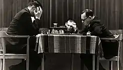 - Esta obra contiene una traducción derivada de «World Chess Championship 1954» de Wikipedia en inglés, publicada por sus editores bajo la Licencia de documentación libre de GNU y la Licencia Creative Commons Atribución-CompartirIgual 3.0 Unported.