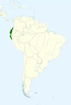 Habita en bosques secos y bosques húmedos de tierras bajas en Colombia, Ecuador y Perú. Está amenazada por la pérdida de hábitat.