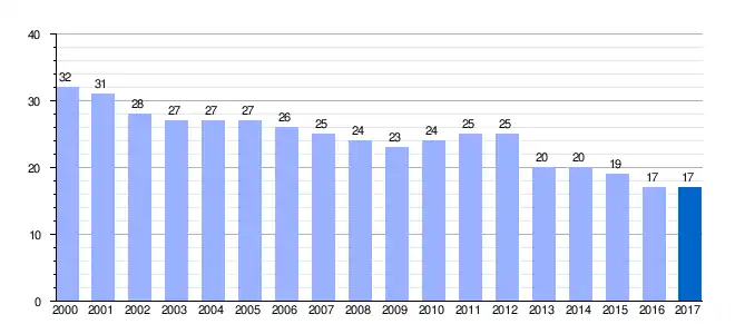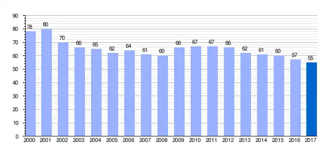 Gráfica de evolución demográfica de Campo de Ledesma (núcleo urbano)[6] entre 2000 y 2017 |