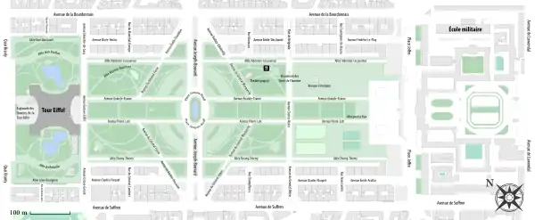 Vías adyacentes | avenida Charles Floquet (SE), quai Branly (NO), plaza Joffre (SO) y avenidas Elisée Reclus, Emile Deschanel y Fréderic le Play (NE) | |