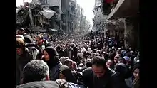 Desde que comenzase la guerra, en la Siria actual, el número de refugiados en Yarmouk se ha visto reducido hasta alcanzar los apenas 8.000 palestinos.[3] Se estima que más del 50% de los 525.000 refugiados palestinos en Siria se han visto obligados a marcharse.[4] Algunos se han convertido en desplazados dentro del propio país, otros han muerto o se han refugiado en algún país vecino, y la minoría permanece en su lugar habitual pero con unas condiciones de vida muy precarias. Desde 2013 Yarmouk es una zona sitiada, donde la ayuda humanitaria entra con cuentagotas, a barrios colindantes, aunque la mayoría del tiempo permanence totalmente bloqueada. Diferentes grupos armados se han hecho con el control del barrio, intesificando la violencia y recrudenciendo la vida.[3]