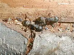 - "Hormigas carpinteras" o "madereras" construyendo su nido en la madera.