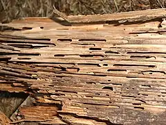 - Muestra de madera deteriorada por la excavación de una colonia de "hormigas carpinteras" o "madereras"