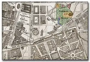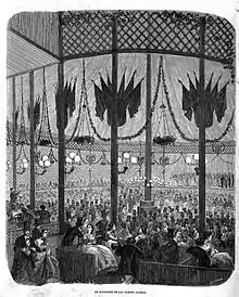 Los Campos Elíseos fueron uno de los más ambiciosos y estériles jardines de recreo de Madrid del siglo xix.[2][3] Tuvieron su origen en una proposición hecha en octubre de 1860 por el empresario catalán José Casadesús al Ayuntamiento de la villa, y se construyeron en terrenos colindantes con la carretera de Aragón, prolongación de la calle de Alcalá (al inicio de la actual calle Velázquez). Fueron inaugurados en junio de 1864,[4][5] y entre otras muchas atracciones, dispusieron de salón de conciertos y bailes, montaña rusa y plaza de toretes.[nota 1] Su popularidad empezó a declinar con la apertura al público en 1868 del vecino parque del Retiro (hasta entonces finca privada de la familia real española); comenzaron a desmantelarse en 1870 con la construcción del barrio de Salamanca). Lo último en desaparecer fue su modesta plaza de toros, en 1881.[6]