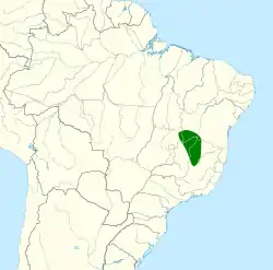 Es endémico de los bosques secos del Atlántico en la parte oriental del país, especialmente en los estados de Minas Gerais, Bahía y Goiás.
